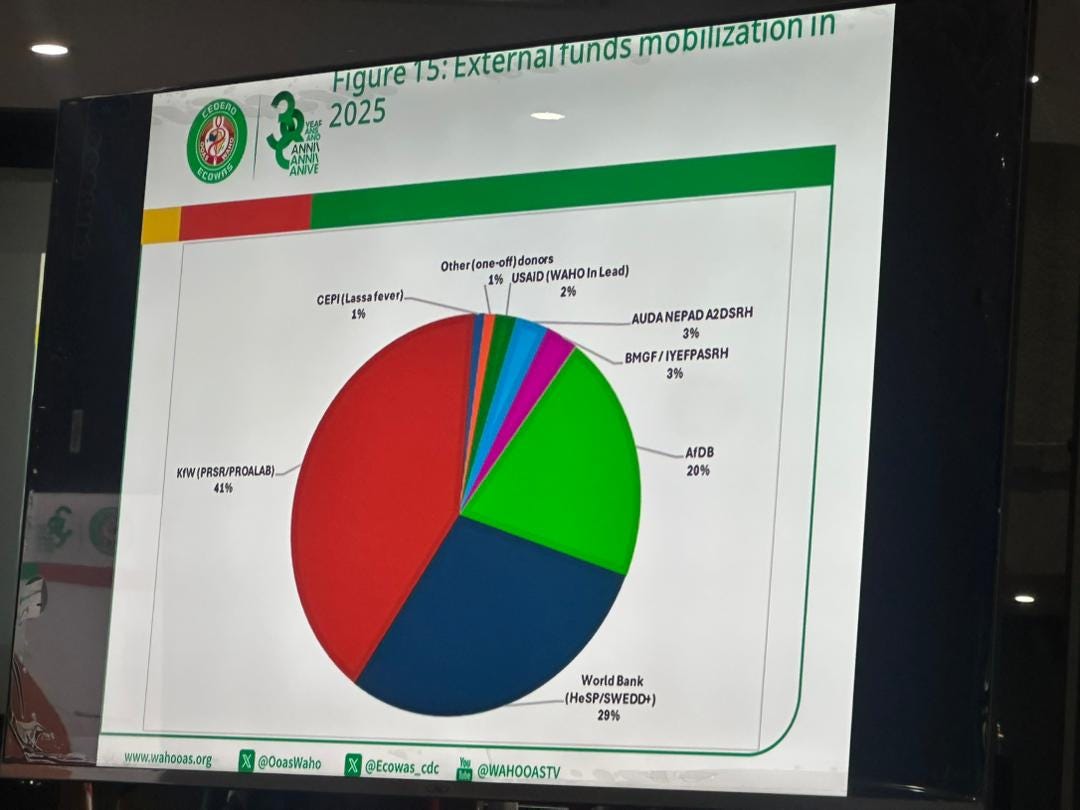However, the 2024 and 2025 figures are alarming. USAID, the African Development Bank, and Germany’s KfW — once pillars of WAHO’s external funding — have dramatically reduced from the ledger. In 2025, KfW accounted for 41% of remaining external funds, with USAID contributing just 2%.