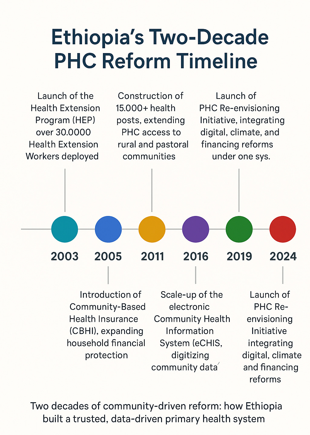 Ethiopia’s PHC re-envisioning phase now integrates digital data, climate resilience, and financing into a future-ready system. Its deeper contribution is proof that systemic change is possible within a generation when reforms are politically anchored, financially domestic, and socially owned.
