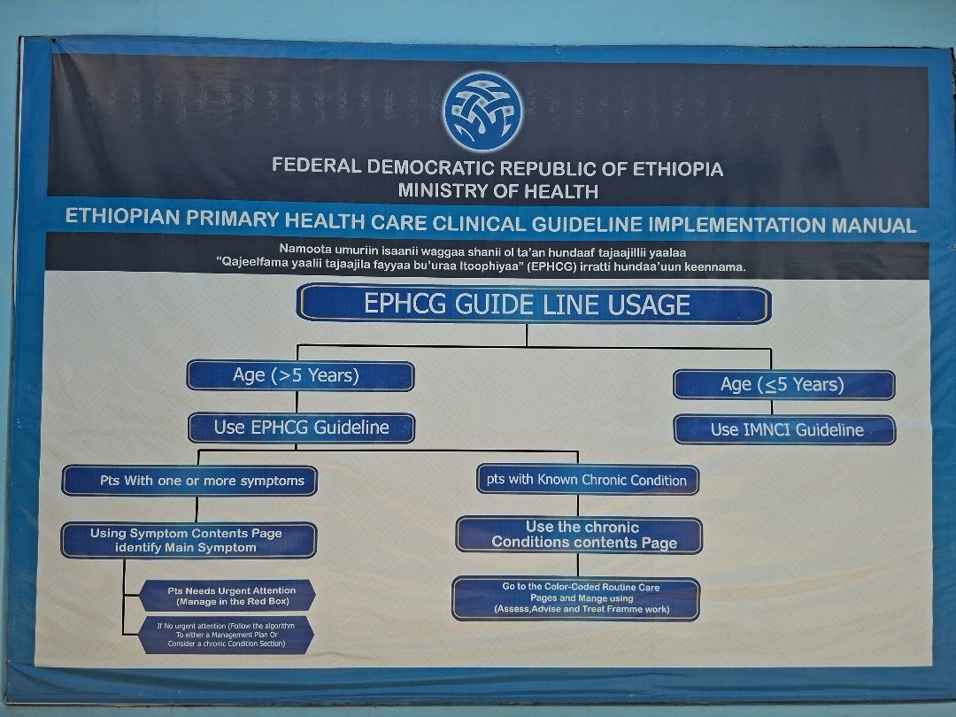 Ethiopian Primary Health Care Clinical Guideline (EPHCG) standardised care through clear, symptom-based protocols. Displayed visibly in facilities.